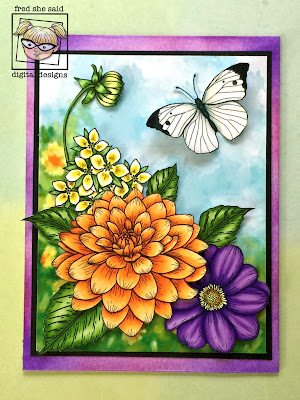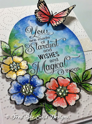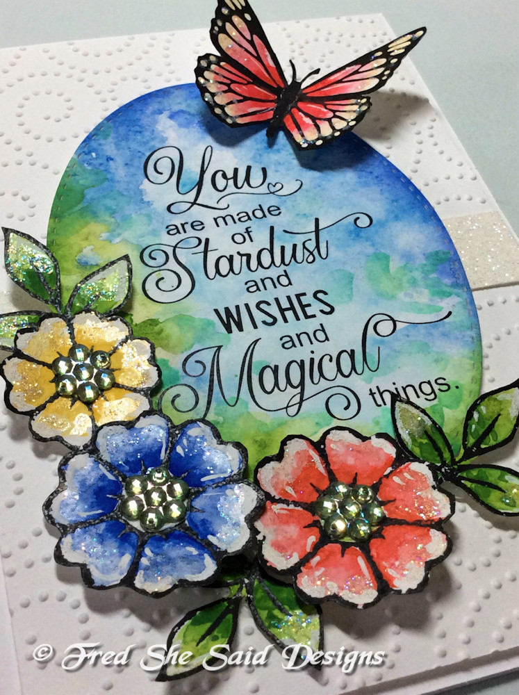 I used Simple Rose Spray DIGI and painted with an assortment of aqua markers. The background was made with a handmade stencil made from CUTFILE Angel Doily Dallion 2019 and distress ink blending.
